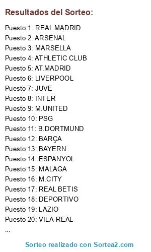 Lista de participantes: ARSENAL, AT.MADRID, ATHLETIC CLUB, B.DORTMUND, BARÇA, BAYERN, BESIKTAS, CHELSEA, DEPORTIVO, ESPANYOL, FENERBACHE, INTER, JUVE, LAZIO, LIVERPOOL, M.CITY, M.UNITED, MALAGA, MARSELLA, NAPOLES, OPORTO, PARMA, PSG, REAL BETIS, REAL MADRID, TOTTENHAM, VILA-REAL.