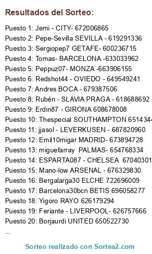 Lista de participantes: ESPARTA087 - CHELSEA 670403017, Pepe-Sevilla SEVILLA - 619291336, Jemi - CITY- 672006865, Rubén - SLAVIA PRAGA - 618688692, Tomas- BARCELONA -633033962, Redshot44 - OVIEDO - 649549241, Peppuz07- MONZA -663906155, jjasol - LEVERKUSEN - 687820960, SoToNaGeRrR - ATLETI - 655855370, Sergiopep7 GETAFE- 600236715, miguefarray PALMAS- 654768334, Mano-low ARSENAL - 676329830, Emil10migar MADRID- 673894728, Andres BOCA - 679387506, Bergalarga30 ELCHE 722696009, Thespecial SOUTHAMPTON 651434444, Borjaurdi UNITED 650522730, Erdin87 - GIRONA 608678008, Feriante - LIVERPOOL- 626757666, Ruguwar BESIKTAS 697686239, Yigoro RAYO 626179294, Barcelona30bcn BETIS 696058277.