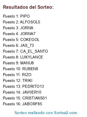 Lista de participantes: JAVIIER10, COKEGOL, MANU8, JAS_73, JABORF85, PIPO, CRISTIAN501, RIZO, JORNA, PEDRITO13, ALFOSOL5, RUBEN8, JORNA7, TRIKI, LUKYLANCE, CA_EL_SANTO.
