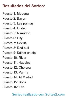 Lista de participantes: Red bull, Chelsea, Fcb, Las palmas, Káiser chiefs, Parma, City, Boca, United, River, Nápoles, R.madrid, Bayern, Sevilla, Modena, At Madrid.