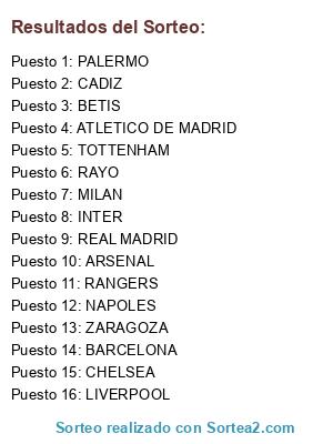 Lista de participantes: RANGERS, NAPOLES, ATLETICO DE MADRID, BARCELONA, BETIS, CHELSEA, TOTTENHAM, LIVERPOOL, MILAN, RAYO, REAL MADRID, ZARAGOZA, ARSENAL, INTER, CADIZ, PALERMO.
