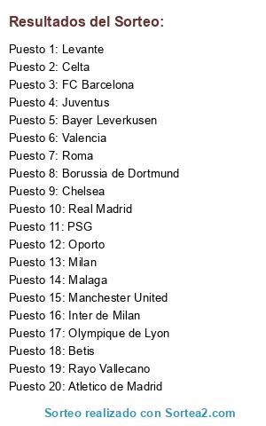 Lista de participantes: PSG, Atletico de Madrid, Oporto, Malaga, Milan, FC Barcelona, Levante, Rayo Vallecano, Bayer Leverkusen, Borussia de Dortmund, Inter de Milan, Manchester United, Juventus, Real Madrid, Valencia, Olympique de Lyon, Betis, Celta, Roma, Chelsea.