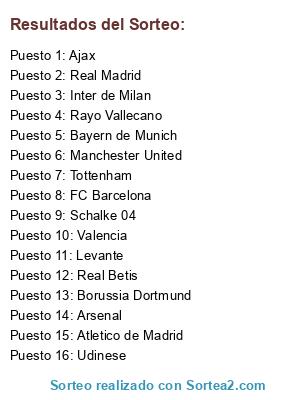 Lista de participantes: Tottenham, Arsenal, Rayo Vallecano, Atletico de Madrid, Real Madrid, Manchester United, Schalke 04, Borussia Dortmund, Bayern de Munich, Levante, Valencia, Inter de Milan, Real Betis, Ajax, Udinese, FC Barcelona.