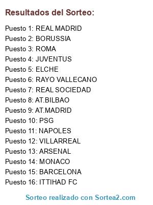 Lista de participantes: AT.MADRID, ITTIHAD FC, JUVENTUS, BORUSSIA, ARSENAL, BARCELONA, ELCHE, ROMA, REAL SOCIEDAD, PSG, AT.BILBAO, VILLARREAL, RAYO VALLECANO, NAPOLES, MONACO, REAL MADRID.