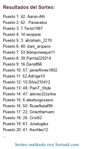 Lista de participantes: 1. Jokerplay767, 2.casalloruben, 3. abraham_2210, 4. lriestral, 5. nanodelamora, 6.alexburgoszero, 7.Toroo1997, 8.edurus20, 9 jose7tronki, 10.Silva210412, 11 scurfy_coconout9, 12.davicito_7sc, 13.perico_7991, 14.soopass, 15guillermotell93, 16.Danidf66, 17.MsRuleticas, 18 RUBENCIN46, 19.eerriikk_cr7, 20. Pinomar_3, 21. crispi-7, 22. Griezthemann, 23. Davidgc17, 24. Soriansen10, 25. Mochilula6, 26. Crivi92, 27. Futbolpro2017, 28. Pabloambrosio22, 29. AdrianGR24, 30.KariiMx20, 31. asdfghjkl1234995, 32 . Fogue, 33 Adrianlp92, 34. Togat1998, 35. Balacias11, 36. Roger__compa, 37. sanpedro12345, 38. TRoofiiC, 39.Parrita220214, 40. dani_arquero, 41. Kevfdez12, 42. Aaron-Alh, 43. albeto1, 44. Id: EnriGomez10, 45. Jonart4, 46. angeeliyo97, 47. alonso22carlos, 48. PainT_Style, 49. robertolobo10, 50. Rusefkalaf99, 51.pabloggv, 52.Adriige10, 53.fabiopinseque11, 54. emcalin23, 55. guacamayos7, 56. Calderoonn, 57. javierflores1802, 58.MatiGolerl22l, 59. Dgallardogil69, 60. Jokincampo7, 61. Joseluglez, 62. Panaveloz, 63. MarrokinXD, 64. Copetepastor0905.