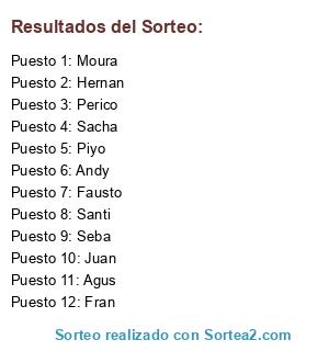 Lista de participantes: Agus, Andy, Fausto, Fran, Hernan, Juan, Moura, Perico, Piyo, Sacha, Santi, Seba.
