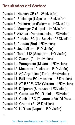 Lista de participantes: Altzibar (Domodossola - 1ªDivisión), Portugalete (Milano - 1ªDivisión), Pañales FC (La Spezia - 2ª División), Golosinas FC (Rimini - 1ªDivisión), N.Risas (Napoli - 1ªDivisión), Team 442 (Sestriere - 1ªDivisión), Puteam (Bari- 1ªDivisión), Delparon (Siracusa - 1ªDivisión), Daniatrakos (Palermo - 1ªDivisión), Malakhatones (Rimini - 2ª División), Ballerina FC (Messina - 1ª División), CUPONES (Torino - 1ªDivisión), AT BEPEJOTA (Verona - 1ªDivisión), Cachito FC (Tavarnelle Val Di Pesa - 1ªDivisión), Macarrod (Positano - 1ª División), Jevi (Milan - 1ª División), Gnomo (? - 2ª División), Macinger Z (Napoli - 1ª División), Sitelodigo (Nápoles - 1ª división), Zanark (? - 1ª división), Heaven CF (? - 2ª división), Ancestral (Gallarate - 3ª división), AC Argentino ( Turín - 6ª división).