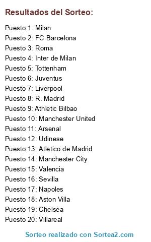 Lista de participantes: R. Madrid, FC Barcelona, Milan, Inter de Milan, Manchester United, Manchester City, Liverpool, Aston Villa, Chelsea, Roma, Arsenal, Villareal, Sevilla, Atletico de Madrid, Athletic Bilbao, Valencia, Napoles, Udinese, Tottenham, Juventus.