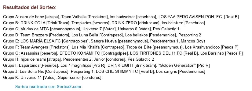 Lista de participantes: Universo 11 [Vatos], Universo 7 [Vatos], Universo 6 [vatos], LOS CHE SHIMMY FC [Real B], LOS YAA PERO AVISEN POH. FC. [Real B], LOS TIRITONES DEL 11 FC [Real B], EFECTO KONAMI FC [Contragolpes], LOS MARÍA ELSA FC [Contragolpes], Los Mia Khalifa [Contrapeso], Los Luna Bella [Contrapeso], Los Sofia Nix [Contrapeso], Pesdementes 1, Pesdementes 2, Pes Galactic 1, Pes Galactic 2, Pesporting 1, Pesporting 2, Los cangris [Pesdemonios], Los bellakos [Pesdemonios], Mancos Boys, hijos de mami [atrapa], cara de bebe [atrapa], Los Krashvandicoo [Pesos P], Los Barsinso [Pesos P], Tropa de Elite [pesanonymous], Viudas de MTG [pesanonymous], Sangre Nueva [pesanonymous], DRINK COLA [Drink Team], DRINK ZERO [drink team], DRINK LIGHT [drink team], "Golden Generation" [Pro R], Los 7 magníficos [Pro R], Team Valhalla [Predators], Team Avengers [Predators], Team Brazzers [Predators], Espartanos [Peseros], Assassins [peseros], Templarios [peseros], los heiniken [Pesebrios], los budweiser [pesebrios], Super senior [condores], Junior [condores].
