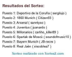 Lista de participantes: Real Jaén ( xiscoblea7 ), Spartak de Moscú ( soundofmusic10 ), Deportivo de la Coruña ( sergilujo ), Bayern Munich ( JB-recre ), 1860 Munich ( Citizen93 ), Millonarios ( carliho_killer89 ), Arsenal ( sanntyso ), Juventus ( juanardo ).