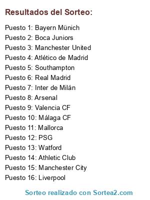Lista de participantes: Borussia Dortmund, Tottenham Hotspur, Real Madrid CF, Sevilla FC, AC Milan, FC Barcelona, Málaga CF, Real Betis, [Chelsea ó PSG], [Arsenal ó Watford], [Liverpool ó Manchester City], [Manchester United ó Atlético de Madrid], [Inter de Milan ó Mallorca], [Valencia CF ó Southampton], [Athletic Club ó Juventus], [Bayern Münich ó Boca Juniors].