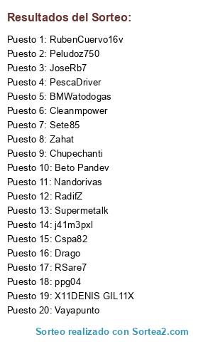 Lista de participantes: JoseRb7, RadifZ, RSare7, RubenCuervo16v, Chupechanti, X11DENIS GIL11X, Cleanmpower, Vayapunto, Nandorivas, ppg04, j41m3pxl, BMWatodogas, Zahat, Supermetalk, Peludoz750, Beto Pandev, Drago, Cspa82, Sete85, PescaDriver.