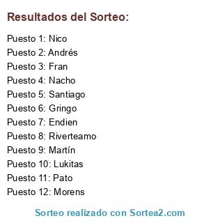 Lista de participantes: Andrés, Endien, Fran, Gringo, Santiago, Lukitas, Martín, Morens, Nacho, Nico, Pato, Riverteamo.