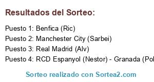 Lista de participantes: Benfica (Ric), RCD Espanyol (Nestor) - Granada (Pol), Real Madrid (Alv), Manchester City (Sarbei).