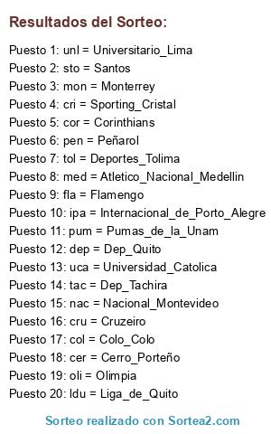 Lista de participantes: tac = Dep_Tachira, nac = Nacional_Montevideo, ldu = Liga_de_Quito, dep = Dep_Quito, cru = Cruzeiro, cor = Corinthians, ipa = Internacional_de_Porto_Alegre, sto = Santos, fla = Flamengo, oli = Olimpia, cer = Cerro_Porteño, col = Colo_Colo, uca = Universidad_Catolica, unl = Universitario_Lima, cri = Sporting_Cristal, med = Atletico_Nacional_Medellin, tol = Deportes_Tolima, mon = Monterrey, pum = Pumas_de_la_Unam, pen = Peñarol.