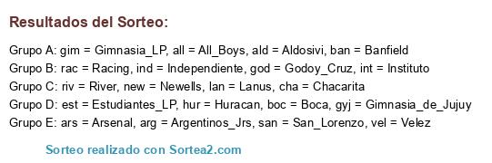 Lista de participantes: all = All_Boys, arg = Argentinos_Jrs, ars = Arsenal, ban = Banfield, boc = Boca, est = Estudiantes_LP, gim = Gimnasia_LP, god = Godoy_Cruz, hur = Huracan, ind = Independiente, lan = Lanus, new = Newells, rac = Racing, riv = River, san = San_Lorenzo, vel = Velez, ald = Aldosivi, cha = Chacarita, gyj = Gimnasia_de_Jujuy, int = Instituto.