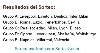 Lista de participantes: Roma, Liverpool, Lazio, Milan, Inter Milán, Napoles, Wolfsburgo, Valencia, Sevilla, Everton, Bilbao, Leverkusen, Fenerbahce, Lyon, Tottenham, Oporto, Benfica, Villarreal, Shalke04, Real sociedad.