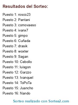 Lista de participantes: Cebollo, comovaeso, drasik, Garzzo, gimpo, Ivanquel, ivanx7, Juancho, luisgon, Nando, rosco23, ToPoTa, woxter, Sagan, Pantani, Cuñada.