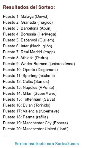 Lista de participantes: Celtic (Santos), Manchester United (Jordi), Inter (Nach_gijón), Málaga (Deivid), Sporting (ricchetti), Milan (SuperMario), Real Madrid (rmpp), Espanyol (Guillem), Barcelona (Abun), Valencia (rubenteve), Athletic (Pedro), Rayo (Elfus), Napoles (VPonte), Weder Bremen (juniorcodema), Oporto (Diegomani), Manchester City (Foneta), Tottenham (Salva), Granada (magico), Roma (yuyu), Borussia (HeriVega), Parma (rafilla), Evian (Torinido).