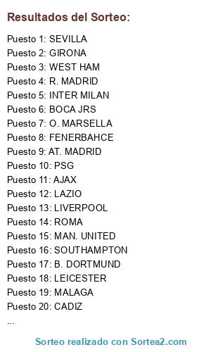 Lista de participantes: MAN. UNITED, KAA GENT, AT. MADRID, R. MADRID, MALAGA, CHELSEA, NAPOLES, WEST HAM, PSG, CADIZ, INTER MILAN, NIZA, BARCELONA, LAZIO, MILAN, SEVILLA, ARSENAL, B. DORTMUND, SOUTHAMPTON, BOCA JRS, LEICESTER, GIRONA, AJAX, ROMA, LIVERPOOL, MAN. CITIY, O. MARSELLA, FENERBAHCE.