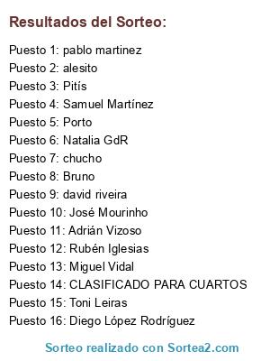 Lista de participantes: José Mourinho, alesito, Adrián Vizoso, Toni Leiras, chucho, david riveira, Miguel Vidal, Diego López Rodríguez, Natalia GdR, Samuel Martínez, Rubén Iglesias, Bruno, pablo martinez, Pitís, Porto, PASA A SIGUIENTE RONDA.