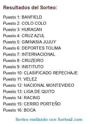 Lista de participantes: RACING, BANFIELD, BOCA, GIMNASIA JUJUY, INSTITUTO, VELEZ, HURACAN, CLASIFICADO REPECHAJE, INTERNACIONAL, CRUZEIRO, LIGA DE QUITO, NACIONAL MONTEVIDEO, CRUZ AZUL, CERRO PORTEÑO, COLO COLO, DEPORTES TOLIMA.