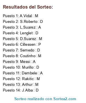 Lista de participantes: A.Vidal M, Arthur M, Cillessen P, Coutinho M, D.Suarez M, Dembele A, J.Alba D, L.Suarez A, Lenglet D, Messi A, Murillo D, Rakitic M, S.Roberto D, Semedo D.