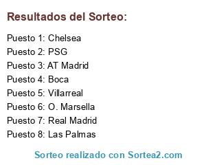 Lista de participantes: AT Madrid, Boca, Chelsea, Las Palmas, O. Marsella, PSG, Real Madrid, Villarreal.