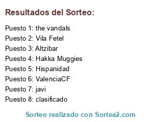 Lista de participantes: Vila Fetel, Hakka Muggies, ValenciaCF, Altzibar, Hispanidad, javi, the vandals, clasificado.