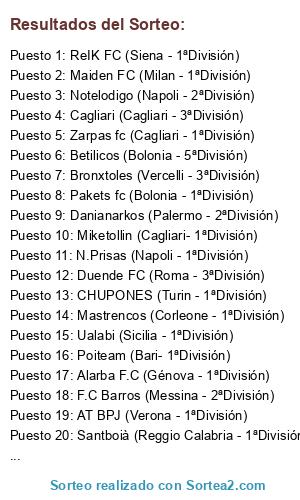 Lista de participantes: N.Prisas (Napoli - 1ªDivisión), Miketollin (Cagliari- 1ªDivisión), Team 343 (Sestriere - 1ªDivisión), AT BPJ (Verona - 1ªDivisión), Javi (Milano - 2ªDivisión), Poiteam (Bari- 1ªDivisión), AC Piacenza (Piacenza - 5ªDivisión), Spaceballs (Roma - 2ªDivisión), Cagliari (Cagliari - 3ªDivisión), Mastrencos (Corleone - 1ªDivisión), Barakaldo (Milan - 1ªDivisión), Maiden FC (Milan - 1ªDivisión), Santboià (Reggio Calabria - 1ªDivisión), Zarpas fc (Cagliari - 1ªDivisión), Danianarkos (Palermo - 2ªDivisión), CHUPONES (Turin - 1ªDivisión), Bronxtoles (Vercelli - 3ªDivisión), Duende FC (Roma - 3ªDivisión), Ualabi (Sicilia - 1ªDivisión), ReIK FC (Siena - 1ªDivisión), F.C Barros (Messina - 2ªDivisión), Huetor CF (Udine - 6ªDivisión), Pakets fc (Bolonia - 1ªDivisión), Alarba F.C (Génova - 1ªDivisión), Vila Fetel ( - 2ªDivisión), Betilicos (Bolonia - 5ªDivisión), Notelodigo (Napoli - 2ªDivisión), Zanark FC (Verona - 2ªDivisión), Hell C.F. (Palermo - 2ªDivisión), Altzibar (Malles Venosta - 4ªDivisión).