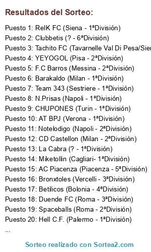 Lista de participantes: N.Prisas (Napoli - 1ªDivisión), Miketollin (Cagliari- 1ªDivisión), Team 343 (Sestriere - 1ªDivisión), AT BPJ (Verona - 1ªDivisión), Barakaldo (Milan - 1ªDivisión), Duende FC (Roma - 3ªDivisión), F.C Barros (Messina - 2ªDivisión), Danianarkos (Palermo - 2ªDivisión), Cagliari (Cagliari - 3ªDivisión), Betilicos (Bolonia - 4ªDivisión), Poiteam (Bari- 1ªDivisión), YEYOGOL (Pisa - 2ªDivisión), Ualabi (Sicilia - 1ªDivisión), Bronxtoles (Vercelli - 3ªDivisión), Hell C.F. (Palermo - 1ªDivisión), CHUPONES (Turin - 1ªDivisión), Spaceballs (Roma - 2ªDivisión), CF Getafi (?- 5ªDivisión), Javi (Milano - 2ªDivisión), ReIK FC (Siena - 1ªDivisión), Clubbetis (? - 6ªDivisión), Notelodigo (Napoli - 2ªDivisión), Pakets fc (Bolonia - 1ªDivisión), Maiden FC (Milan - 1ªDivisión), AC Piacenza (Piacenza - 5ªDivisión), CD Castellon (Milan - 2ªDivisión), La Cabra (? - 1ªDivisión), Tachito FC (Tavarnelle Val Di Pesa/Siena - 5ªDivisión), Altzibar (Livigno - 3ªDivisión).