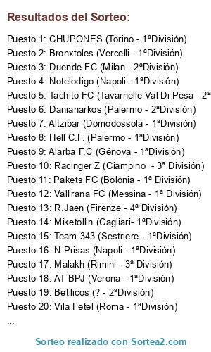 Lista de participantes: Altzibar (Domodossola - 1ªDivisión), N.Prisas (Napoli - 1ªDivisión), Miketollin (Cagliari- 1ªDivisión), Team 343 (Sestriere - 1ªDivisión), AT BPJ (Verona - 1ªDivisión), Barakaldo (Milano - 1ªDivisión), Camarod (Torino - 2ª División), Javi (Roma - 2ªDivisión), Ualabi (Sicilia - 1ªDivisión), Danianarkos (Palermo - 2ªDivisión), Poiteam (Bari- 1ªDivisión), Bronxtoles (Vercelli - 1ªDivisión), Duende FC (Milan - 2ªDivisión), Hell C.F. (Palermo - 1ªDivisión), Malakh (Rimini - 3ª División), Vila Fetel (Roma - 1ªDivisión), Leyales FC (La Spezia - 5ª División), Notelodigo (Napoli - 1ªDivisión), Deltiron (Siracusa - 2ªDivisión), R.Jaen (Firenze - 4ª División), Vallirana FC (Messina - 1ª División), Golonis FC (Rimini - 3ªDivisión), CHUPONES (Torino - 1ªDivisión), Woning CF (Turin - 5ªDivisión), Pakets FC (Bolonia - 1ª División), Alarba F.C (Génova - 1ªDivisión), Tachito FC (Tavarnelle Val Di Pesa - 2ªDivisión), Racinger Z (Ciampino - 3ª División), Bahia CF (Ercolano - 3ª División), Betilicos (? - 2ªDivisión).