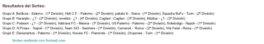 Lista de participantes: Vila Fetel - Roma - (1ª División), Altzibar - ¿? - (3ª División), Novara FC - Piamonte - (1ª División), Hell C.F. - Palermo - (2ª División), Squadra BuFu - Turin - (2ª División), Poiteam - ¿? - (3ª División), Danianarkos - Palermo - (1ª División), Notelodigo - Napoli - (1ª División), Team 343 - Sestriere - (1ª División), Cagliari - Cagliari - (3ª División), Naranjito - ¿? - (2ª División), Betilicos - Salerno - (1ª División), Camarod - Roma - (2ª División), N.Prisas - Napoli - (1ª División), US Palermo - Palermo - (2ª División), pakets fc - Siena - (1ª División), novelda - ¿? - (4ª División), Chupones - Turin - (1ª División), Vallirana FC - Mesina - (1ª División).