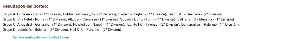 Lista de participantes: Altzibar - Cavalese - (1ª división), Poiteam - Bari - (1ª División), Ancestral - Gallarate - (1ª División), Vila Fetel - Roma - (1ª División), Danianarkos - Palermo - (1ª División), Team 343 - Sestriere - (2ª División), Squadra BuFu - Turin - (1ª División), Cagliari - Cagliari - (1ª División), Notelodigo - Napoli - (1ª División), Vallirana FC - Messina - (1ª División), pakets fc - Bolonia - (2ª División), Hell C.F. - Palermo - (2ª División), Tachito FC - Firenze - (2ª División), LoMasFashion - ¿? - (2ª División).