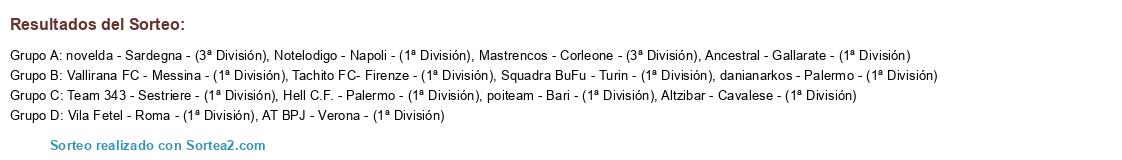 Lista de participantes: Vila Fetel - Roma - (1ª División), danianarkos - Palermo - (1ª División), Mastrencos - Corleone - (3ª División), Altzibar - Cavalese - (1ª División), Ancestral - Gallarate - (1ª División), Notelodigo - Napoli - (1ª División), Hell C.F. - Palermo - (1ª División), novelda - Sardegna - (3ª División), poiteam - Bari - (1ª División), Team 343 - Sestriere - (1ª División), AT BPJ - Verona - (1ª División), Squadra BuFu - Turin - (1ª División), Tachito FC- Firenze - (1ª División), Vallirana FC - Messina - (1ª División).