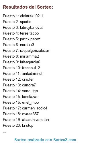 Lista de participantes: rozul, yolanda.torresbarquill, visilopezfelip, vi_lo_z, vircamen, virginiairagu, vane_rm8, vane_tgn, adaia, tcolino, susanapaulagilusano, sofia_fm, silbart, s.blanco7, csmas_sar, luna0azu, rutyte9, sharoa, romidiciembr, syntheticbutterfl, rhaquel3, raqta, raquelgonzalezar, bolitasworl, huijk, rafayy, mpmelendez1, pilar__281, prodriguez, rubertsmallorc, misstifor, patrix.perez, Olipope, nuriamg6, noemisha, xipreir, elblogdeninabenit, nerea54, nelapomedi, natividadsansierr, natillaj, nataliadazavel, txu, myri31, avistadem, montse.perez8, mabreu_96, mencina, monicamartinez3, miriamma2, Miriam.g.m.8, Miriam_calda, Myriami, labrujitanovat, mseijas, mayte24, canora7, freesoul_2, afroditam, martam_, twilighte, m.miranda21, mara4895, charmedinthebeac, rmorale, dunas3, lucreciaborgia198, pilica197, kery-2, mariajo8, mje_2, mjanemartine, Mariaher95, marub_sta, vilocha6, maryalv0, marjerez0, marmalab, misela197, marhya_m_o198, trufon3, marhta_m_o198, creativaria, carmenmartos4, eldiariodemaria, teresitacoo, mguced, marinmorenomargarit, mamen1976v, msevillad, maite-fl, msantiago196, luisagarcia6, elektrak_02_l, 91foreveryoung9, perlica8, leirelazar, eriel_moo, leireazket, lulete9, katiblag, kaml.b, huijks, spadic, jessikausano, isa_gr_1, asira_a, isabdlul, irenea198, macugonzalez_, mapachitoblogge, inesita-9, g_cuetar, gema8, francis_bdj, evachico, Evasilvestre, cukad, evaaa357, etv7, e.s.a3, aurorabri, mariajose3b, cristinavaleix, zeltia2, kristop, cris.fer, cristinalopez199, kelika.7, charoal3, alwaysso, ceciliacinjordi, carol.roge, carolxx3, carmen_rocio4, mamenjoaquin3, asturianina4, cargarm, candidolopez5, caminogarat, worldofbianc, bely_c, b.coc, beavaldescerez, beayflo, bpirace, miss.potingues.mai, starsy_lokit, b.quijan, leticia.eguilaz.lazcan, aroaalpuenteg, ramoza5, poxola_3, anahisuarezmartin1, anismar, ana_isabel_199, anitadiminut, anna_rbyta_2, solete78, abasuniversitari, Anamfercanga, alazne.penach, moskisgrr, aguedamat, agatha15b.