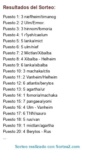 Lista de participantes: 1 niefelheim/vanheim, 1 r'lyeh/caelum, 1 fomoria/machaka, 1 mictlan/agartha, 2 Mictlan/Xibalba, 2 Lanka/Kailasa, 2 Vanheim/Helheim, 2 Ulm/Ermor., 3 nieflheim/tirnanog, 3 hinnom/fomoria, 3 machaka/ctis, 3 marverni/sauramatia, 4 Fomoria - Niefelheim, 4 Xibalba - Helheim, 4 Ulm - Vanheim, 4 Berytos - Rus, 5 lanka/mict, 5 rus/van, 5 agartha/ur, 5 ulm/nief, 6 TNN/sauro, 6 arco/Vannheim, 6 lanka/xibalba, 6 atlantis/berytos, 7 TienChi/sauromatia, 7 pangaea/yomi, 7 Ulm/TNN, 7 abysia/ermor.