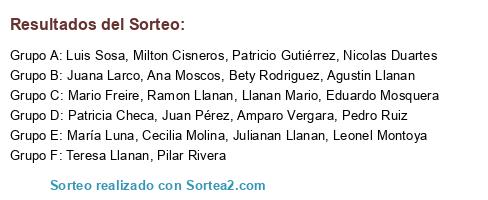 Lista de participantes: Juan Pérez, Luis Sosa, Pedro Ruiz, Leonel Montoya, Eduardo Mosquera, Patricio Gutiérrez, Mario Freire, Milton Cisneros, María Luna, Pilar Rivera, Patricia Checa, Amparo Vergara, Cecilia Molina, Ana Moscos, Bety Rodriguez, Juana Larco, Llanan Mario, Julianan Llanan, Ramon Llanan, Agustin Llanan, Teresa Llanan, Nicolas Duartes.