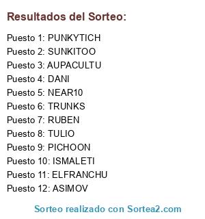 Lista de participantes: TULIO, AUPACULTU, NEAR10, ELFRANCHU, RUBEN, DANI, ISMALETI, ASIMOV, PUNKYTICH, SUNKITOO, TRUNKS, PICHOON.