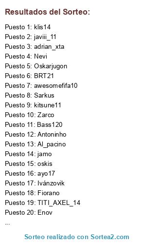 Lista de participantes: Guti, Jorge, Diarce, Ivan, Josito, Adri_Twist, Efrain, Adri, Sesi, Sack, V3sTi4, Mustik, Mario, Jhor, Ponzio, Correa, Mike, Jordi.