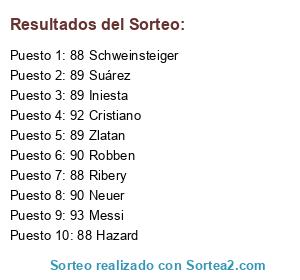 Lista de participantes: 93 Messi, 92 Cristiano, 90 Neuer, 90 Robben, 89 Suárez, 89 Zlatan, 89 Iniesta, 88 Hazard, 88 Ribery, 88 Schweinsteiger.