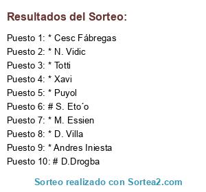 Lista de participantes: # D.Drogba, * Puyol, * Totti, * Cesc Fábregas, * D. Villa, * Andres Iniesta, * Xavi, * N. Vidic, * M. Essien, # S. Eto´o.