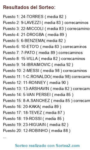 Lista de participantes: 1-C.RONALDO( media 98) correcaminos, 2-MESSI ( media 98 ) correcaminos, 3-ROBBEN( media 93 ) correcaminos, 4-RIBERY ( media 93 ) correcaminos, 5-VAN PERSEI ( media 85 ), 6-BENZEMA( media 82 ), 7-PATO ( media 89 ) correcaminos, 8-A.SANCHEZ ( media 85 ) correcaminos, 9-LAVEZZI ( media 83 ) correcaminos, 10-ETO'O ( media 83 ) correcaminos, 11-RONNEY ( media 90 ), 12-ROBINHO ( media 88 ), 13-ARSHAVIN ( media 82 ) correcaminos, 14-IBRAIMOVIC ( media 92 ), 15-VILLA ( media 82 ) correcaminos, 16-M.ZARATE ( media 82 ) correcaminos, 17-AGUERO ( media 88 ), 18-TEVEZ ( media 87 ), 19-ROSSI ( media 85 ), 20-KAKA( media 89 ), 21-DROGBA ( media 89 ), 22-MICCOLI ( media 83 ) correcaminos, 23-HIGUAIN ( media 82 ), 24-TORRES ( media 82 ).