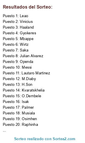 Lista de participantes: Mbappe, Vinicius, Haaland, Bellingham, Salah, Leao, Raphinha, Musiala, Osimhen, O.Dembele, Rodrygo, Luis Diaz, Kvaratskhelia, Fede Valverde, Lautaro Martinez, Gyokeres, Lamine Yamal, Julian Alvarez, Wirtz, Openda, Isak, Messi, Nico Williams, Palmer, M.Diaby, Lookman, Adeyemi, Saka, Iñaki Williams, H.Son.