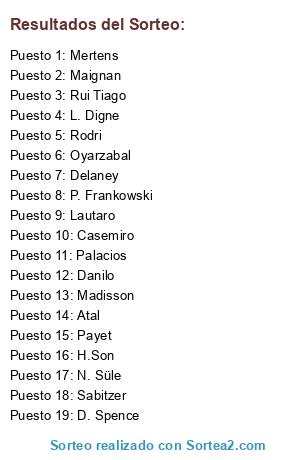 Lista de participantes: Maignan, Rui Tiago, N. Süle, D. Spence, L. Digne, P. Frankowski, Danilo, Atal, Rodri, Sabitzer, Delaney, Madisson, Casemiro, Payet, Palacios, Lautaro, Oyarzabal, Mertens, H.Son.