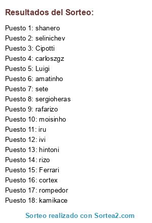 Lista de participantes: kamikace, Cipotti, rizo, carloszgz, cortex, sete, rafarizo, hintoni, ivi, moisinho, rompedor, selinichev, Ferrari, iru, Luigi, sergioheras, amatinho, shanero.