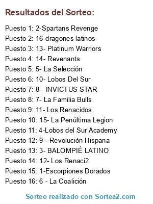 Lista de participantes: 1-Escorpiones Dorados, 2-Spartans Revenge, 3- BALOMPIÉ LATINO, 4-Lobos del Sur Academy, 5- La Selección, 6 - La Coalición, 7- La Familia Bulls, 8 - INVICTUS STAR, 9 - Revolución Hispana, 10- Lobos Del Sur, 11- Los Renacidos, 12- Los Renaci2, 13- Platinum Warriors, 14- Revenants, 15- La Penúltima Legion, 16-Escorpiones Dorados.