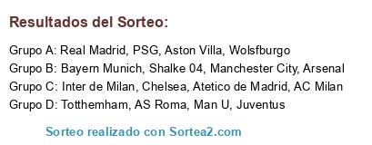 Lista de participantes: Real Madrid, Bayern Munich, Arsenal, Juventus, Chelsea, Aston Villa, PSG, AS Roma, Totthemham, Man U, Atetico de Madrid, Manchester City, Wolsfburgo, Shalke 04, AC Milan, Inter de Milan.