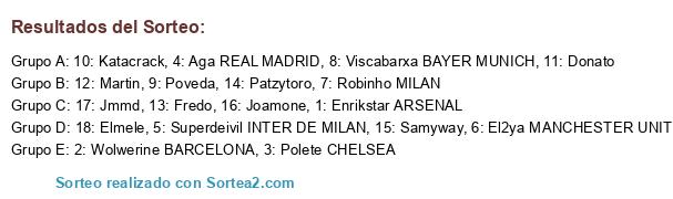 Lista de participantes: 1: Enrikstar ARSENAL, 2: Wolwerine BARCELONA, 3: Polete CHELSEA, 4: Aga REAL MADRID, 5: Superdeivil INTER DE MILAN, 6: El2ya MANCHESTER UNITED, 7: Robinho MILAN, 8: Viscabarxa BAYER MUNICH, 9: Poveda, 10: Katacrack, 11: Donato, 12: Martin, 13: Fredo, 14: Patzytoro, 15: Samyway, 16: Joamone, 17: Jmmd, 18: Elmele.