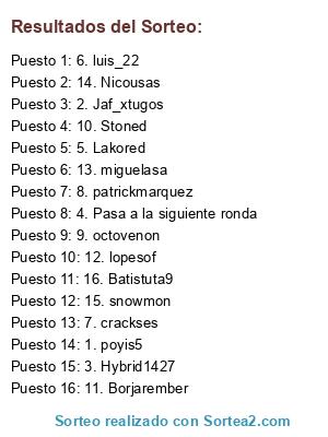 Lista de participantes: 1. poyis5 , 2. Jaf_xtugos , 3. Hybrid1427 , 4. Pasa a la siguiente ronda, 5. Lakored , 6. luis_22 , 7. crackses , 8. patrickmarquez , 9. octovenon , 10. Stoned , 11. Borjarember , 12. lopesof , 13. miguelasa , 14. Nicousas , 15. snowmon , 16. Batistuta9.